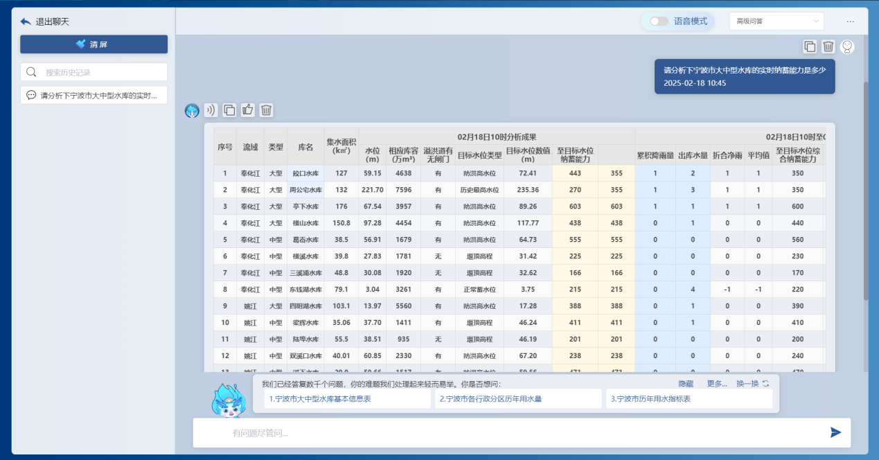 基于前端感知的降雨、水位、流量、工程運(yùn)行等實(shí)時信息,借助DeepSeek大模型和“甬水院智算”算法庫,能夠?qū)崟r對流域防汛形勢進(jìn)行快速分析,包括降雨形勢、水情預(yù)警、預(yù)泄分析、水庫納蓄分析等,可以按照規(guī)定的表單形式一鍵輸出成果,為防汛防洪工作提供兼具前瞻性、科學(xué)性、精準(zhǔn)性、安全性的決策支撐。相關(guān)學(xué)術(shù)成果曾以《基于大模型的水利防汛智能問答關(guān)鍵技術(shù)研究與應(yīng)用探索》為題于去年8月的第七屆城市水安全與水管理學(xué)術(shù)交流會作專題匯報(bào)。