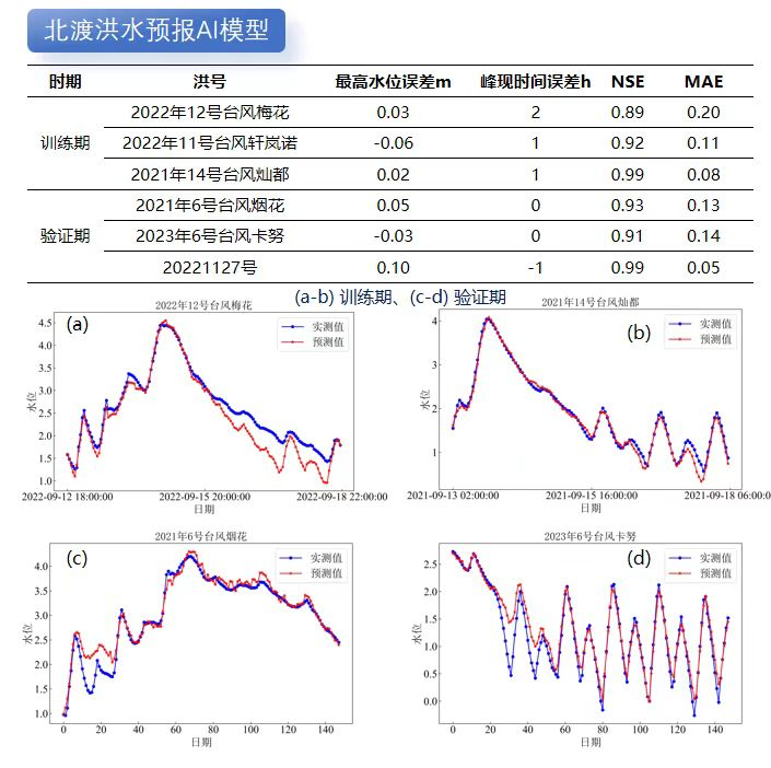 利用成熟水利專業(yè)模型模擬計(jì)算不同降雨潮位邊界條件下的洪水過程數(shù)據(jù),再基于DeepSeek對海量洪水模擬數(shù)據(jù)成果進(jìn)行模型訓(xùn)練和蒸餾。目前我院已對北渡、鎮(zhèn)海等重要流域控制站點(diǎn)進(jìn)行了AI洪水預(yù)報(bào)模型訓(xùn)練和精度驗(yàn)證,結(jié)果表明AI洪水預(yù)報(bào)的準(zhǔn)確性不輸傳統(tǒng)水利專業(yè)模型。