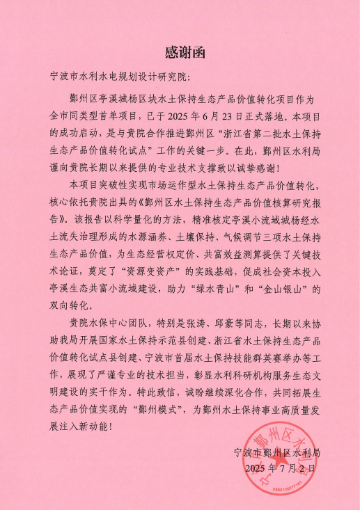 鄞州區(qū)水利局在感謝信中特別指出,我院提供的技術(shù)支持不僅專業(yè)高效,更體現(xiàn)了強烈的責(zé)任意識和服務(wù)意識。信中高度贊揚了水保中心團隊,特別是張濤、邱豪等同志,在相關(guān)工作中展現(xiàn)的嚴謹務(wù)實的工作作風(fēng)、精益求精的專業(yè)態(tài)度,以及不辭辛勞的奉獻精神。這份肯定不僅是對項目組的褒獎,更是對我院全體職工莫大的鼓舞和激勵。