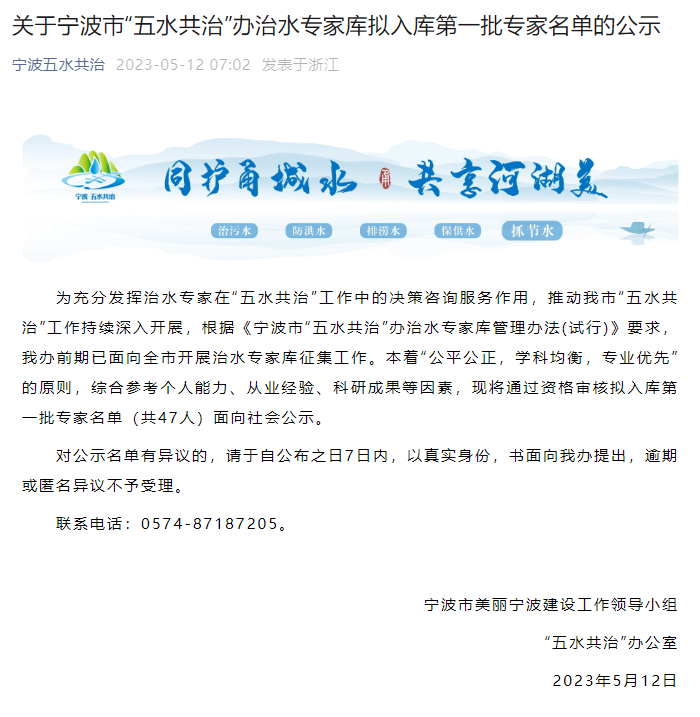 為充分發(fā)揮治水專家在“五水共治”工作中的決策咨詢服務(wù)作用,推動我市“五水共治”工作持續(xù)深入開展,根據(jù)《寧波市“五水共治”辦治水專家?guī)旃芾磙k法(試行)》要求,寧波市美麗寧波建設(shè)工作領(lǐng)導(dǎo)小組“五水共治”辦公室前期已面向全市開展治水專家?guī)煺骷ぷ鳌?/span>