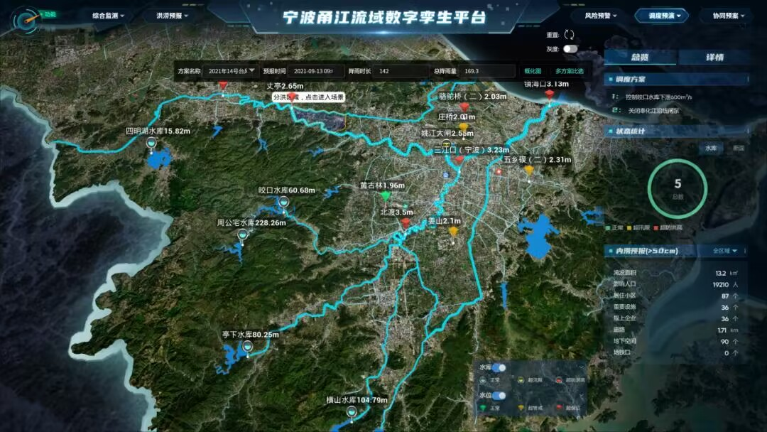 目前,基于寧波甬江流域數(shù)字孿生平臺(tái)打造的防洪應(yīng)用已完成“綜合監(jiān)測(cè)、洪澇預(yù)報(bào)、風(fēng)險(xiǎn)預(yù)警、仿真預(yù)演、協(xié)同預(yù)案”5大功能板塊的開發(fā)和“三江堤防、沿海海塘、重點(diǎn)水庫(kù)、重要設(shè)施內(nèi)澇”4個(gè)“四預(yù)”場(chǎng)景的應(yīng)用。