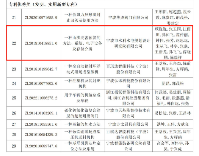 近日,寧波市市場監(jiān)督管理局公布了第三屆寧波市專利創(chuàng)新大賽獲獎項目名單,我院提交參賽的發(fā)明專利“一種山洪災(zāi)害預(yù)警的方法、系統(tǒng)、電子設(shè)備及存儲介質(zhì)”榜上有名,獲得本次大賽的“專利優(yōu)秀獎(發(fā)明、實用新型專利)”。