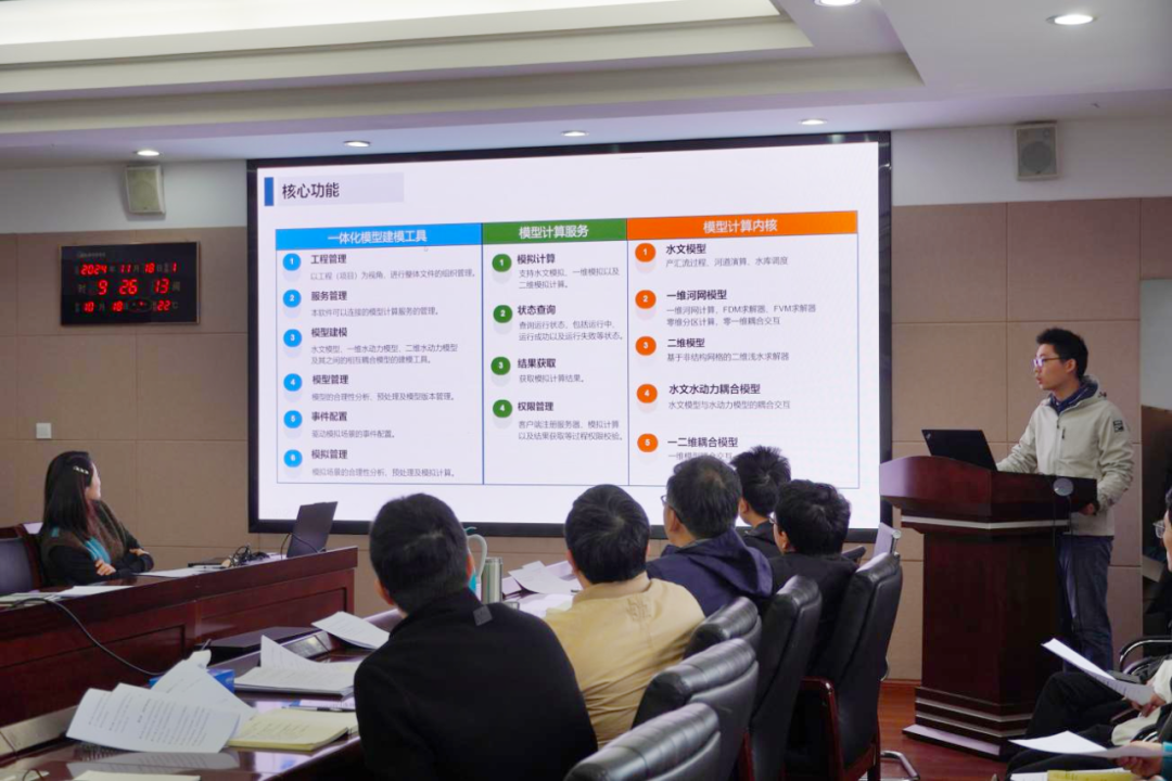 隨后,平臺研發(fā)團隊代表陳龍贊對“澤圖水文水動力一體化模型平臺”進行詳細介紹,并進行現(xiàn)場實操演示。該平臺是一套我院自主研發(fā)的以組件化建模、并行化求解、在線化計算、一體化耦合、國產(chǎn)化支持為核心的水文水動力模型平臺,能夠滿足包括產(chǎn)匯流計算、水庫調(diào)度、一維河網(wǎng)、二維淹沒、水文水動力耦合、一二維水動力耦合在內(nèi)的多種模擬需求,適用于獨立部署、嵌入第三方項目等多種應用場景?;诮9ぞ?、模型服務、計算核心三分離的設計架構(gòu),平臺具備分布式部署、集群化管理、多節(jié)點負載均衡的動態(tài)能力,滿足靈活適用多種尺度的計算需要。